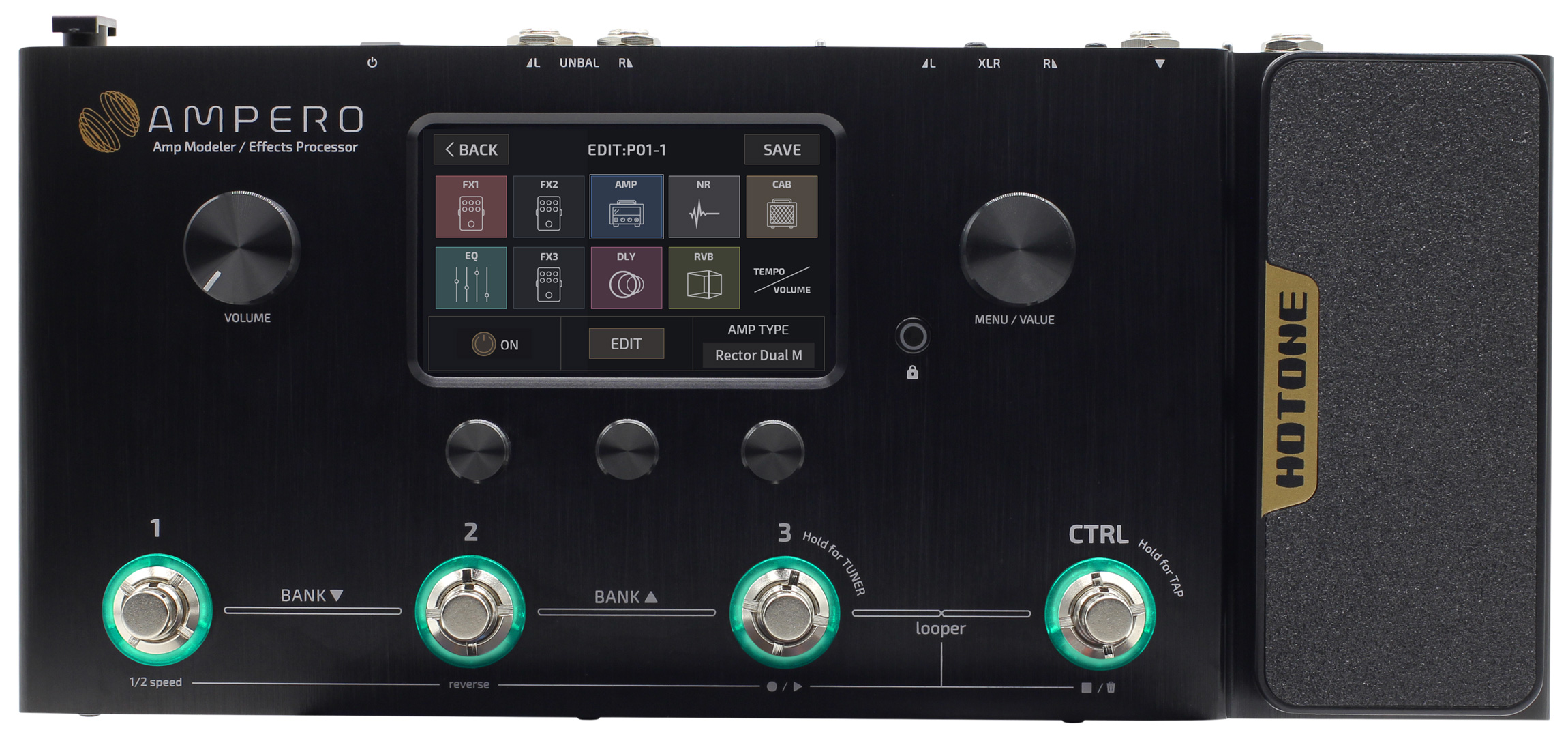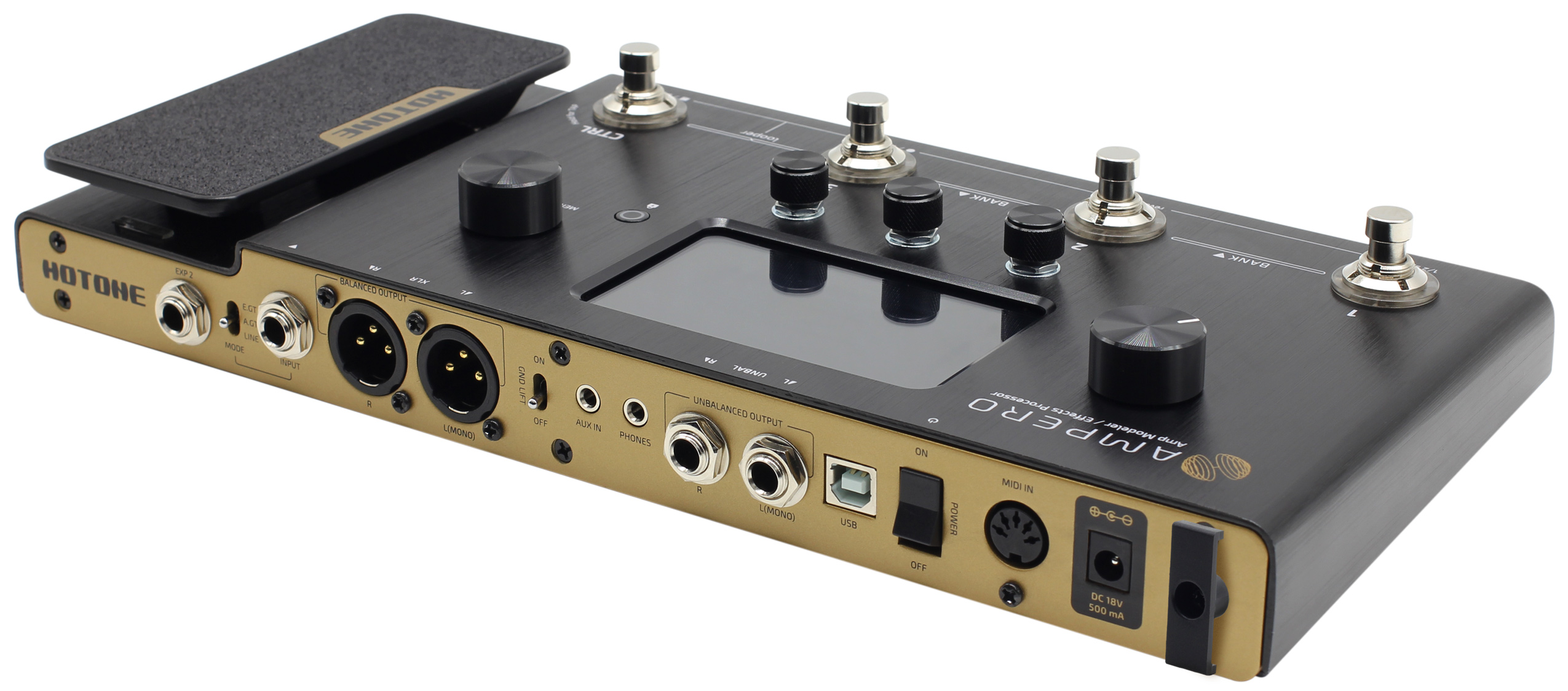 Hotone Ampero – чрезвычайно мощный напольный процессор эффектов, который приятно удивляет своей компактностью и удобством работы с 4-дюймовым сенсорным экраном. Основанная на процессоре SHARC Dual DSP, комбинация схем Comprehensive Dynamic Circuit Modeling High Definition (CDCM HD) и Field Impulse Response Enhancement (F.I.R.E.) обеспечивает безукоризненную естественность звука электрогитар, бас-гитар, акустических инструментов, клавишных и синтезаторов. Встроенный лупер и драм-машина также встроены в устройство. В дополнение к несбалансированным и сбалансированным стереовыходам, Hotone Ampero имеет USB-порт для аудио-интерфейса или обновления прошивки и MIDI-вход. Дополняется Hotone MP-100 Ampero Modeling Floorboard еще и педалью экспрессии, входом Aux-In и джеком для наушников.