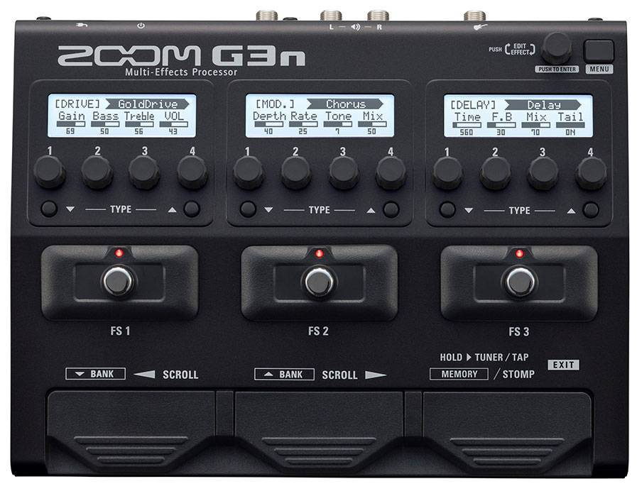 ZOOM G3n – многофункциональный гитарный процессор эффектов от японского бренда Zoom Corporation. Эта модель обладает очень широкими возможностями настройки звука, позволяя максимально гибко регулировать параметры гитарного звучания. Такой процессор позволит Вам свободно экспериментировать со звуком в любых стилях. Модель способна симулировать звучание различных усилителей и гитарных кабинетов, а широкий выбор эффектов, восьмидесятисекундный лупер и удобный, интуитивно понятный интерфейс делают Zoom G3n незаменимым дополнением Вашего педалборда. Всего доступно 70 эффектов DSP (68 разных эффектов плюс педали лупер и ритм) и 10 очень реалистично звучащих эмуляторов усилителей/кабинетов, в том числе имитирующих популярные модели Marshall, Fender, MESA Boogie и других знаменитых брендов. С этой моделью Вы можете использовать все классические гитарные эффекты, в том числе овердрайв, дисторшн, компрессор, дилей, ревербератов, фленджер, фазер, вибрато, хорус, а также эквалайзер. Имеется встроенный хроматический тюнер