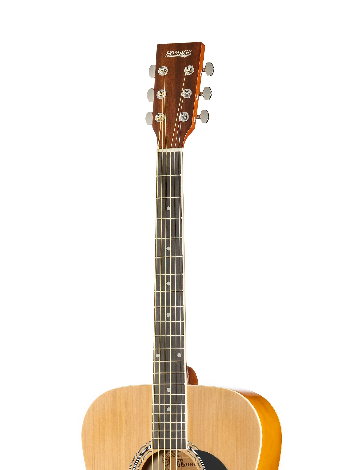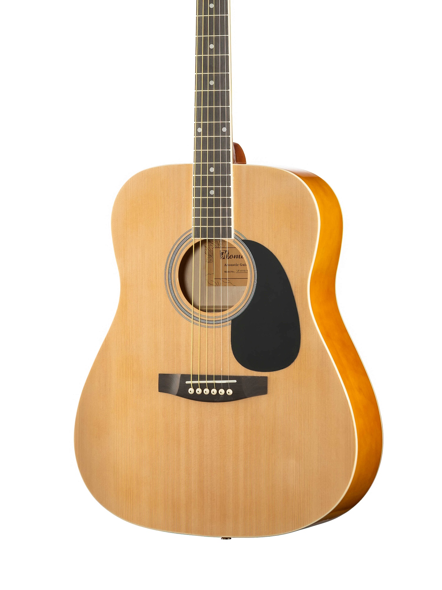 LF-4110-N Акустическая 6-струнная гитара 41". Верхняя дека - ламинат ели, задняя дека и обечайки - ламинат липы, гриф - катальпа, накладка грифа - палисандр, бридж - палисандр, колковая механика - хромированная, окантовка - пластик, цвет - натуральный. HOMAGE