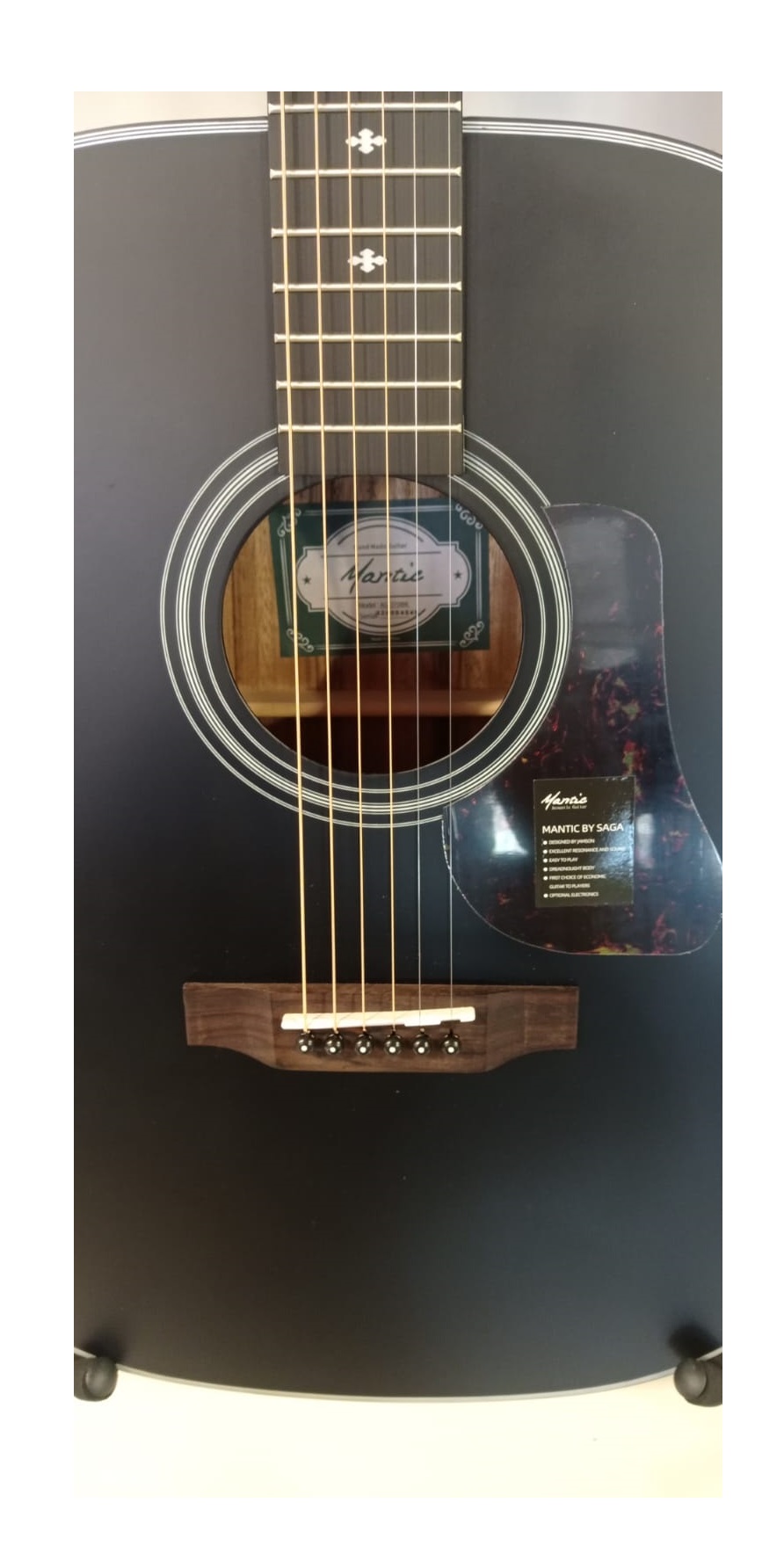 Бридж: Индийский палисандрОкантовка корпуса: Чёрный пластикПикгард: В виде птицыЗадняя дека: Сапеле
