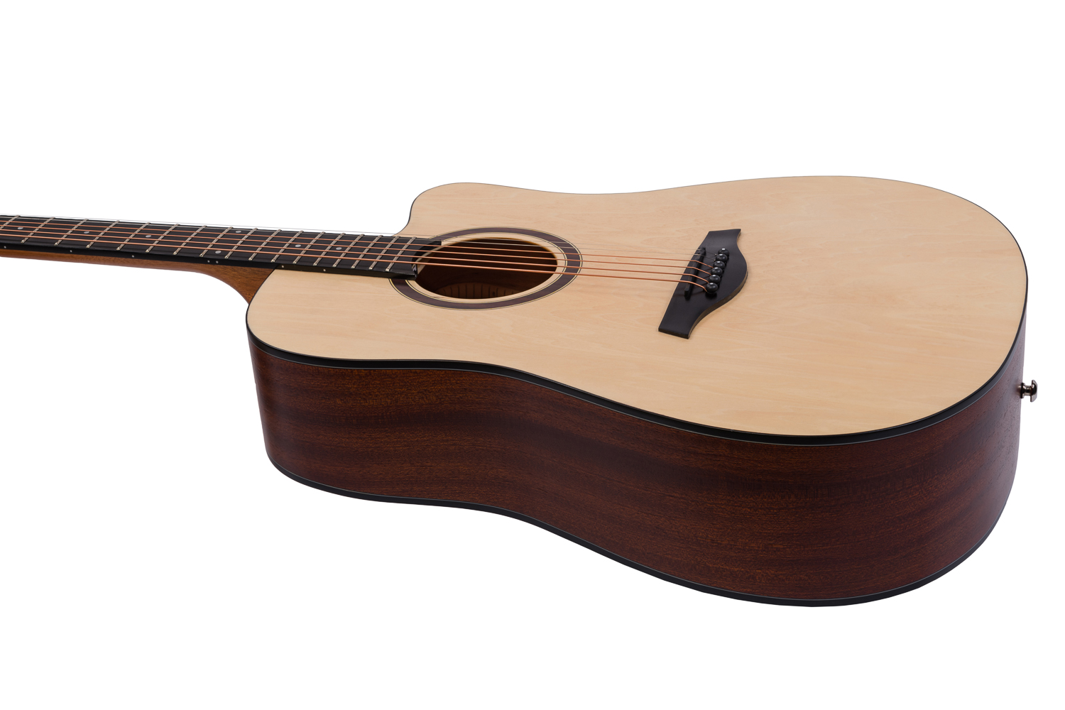 ROCKDALE Aurora D1 C N акустическая гитара. Форма корпуса Dreadnought с вырезом. Цвет натуральный. Матовое покрытие. Верхняя дека из агатиса. Нижняя дека и обечайка из сапеле. Гриф из красного дерева. Анкерный стержень. Накладка на гриф из древесно-полимерного композита. Закрытые колки.