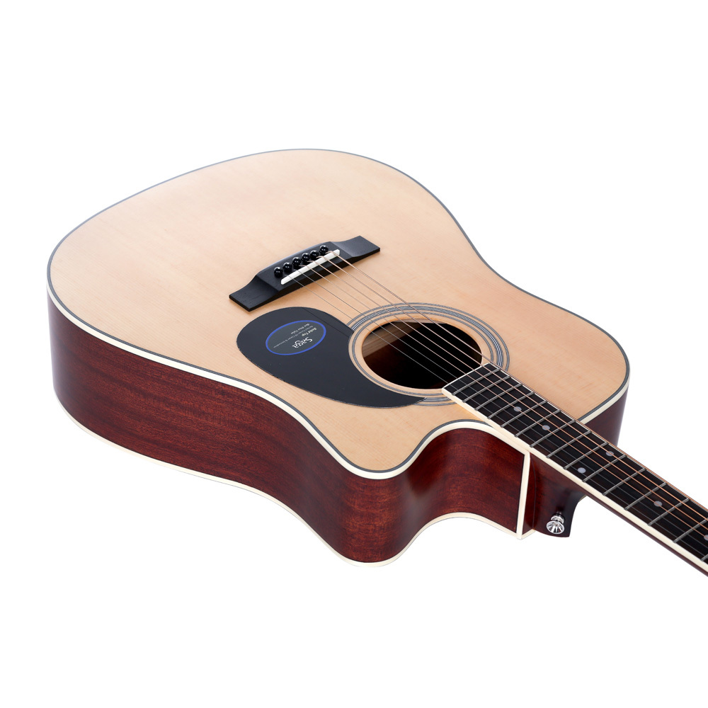 Акустическая гитара с верхней декой из массива ситхинской ели. Обечайки и задняя дека выполнены из сапеле. Трёхслойная окантовка верхней деки и благородный классический цвет корпуса придают инструменту особенное изящество. Гриф из массива нато тщательно отполирован. Накладка из искусственного композита Richlight максимально устройчива к изменениям влажности.