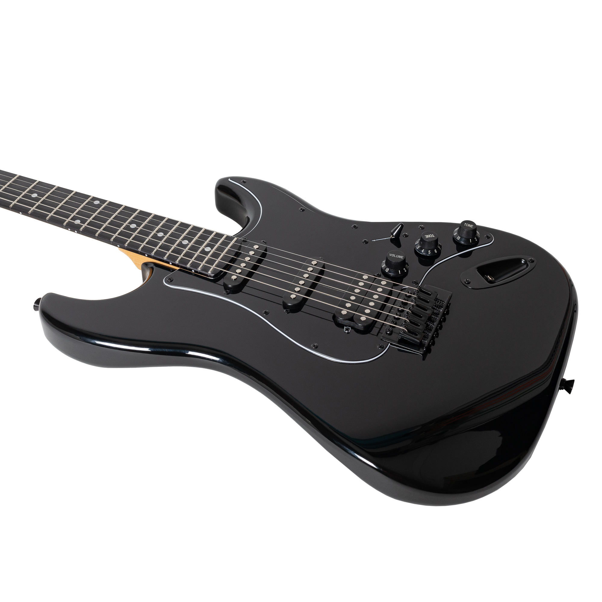 ROCKDALE Stars Black Limited Edition HSS BK электрогитара. Форма корпуса стратокастер. Цвет черный. Глянцевое покрытие. Черная фурнитура. Корпус из тополя. Гриф из клена. 22 лада. Анкерный стержень. Накладка на гриф из древесно-полимерного композита. Бридж тремоло. Конфигурация звукоснимателей H-S-S. Управление звуком: громкость, 2 тона, 5-ти позиционный переключатель. Рекомендованный диаметр струн 10/46.