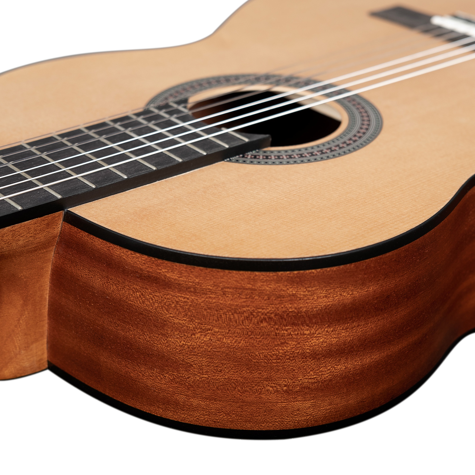Cascha CGC 200 4/4 — это классическая гитара с мензурой 65 сантиметров (39 дюймов). Отборная древесина придает этой модели насыщенный, теплый звук с длительным сустейном. Верхняя дека гитары изготовлена из ели, нижняя дека и обечайка из высококачественного красного дерева, как и гриф. Накладка грифа и бридж изготовлены из прочного амаранта (Purple Heart).