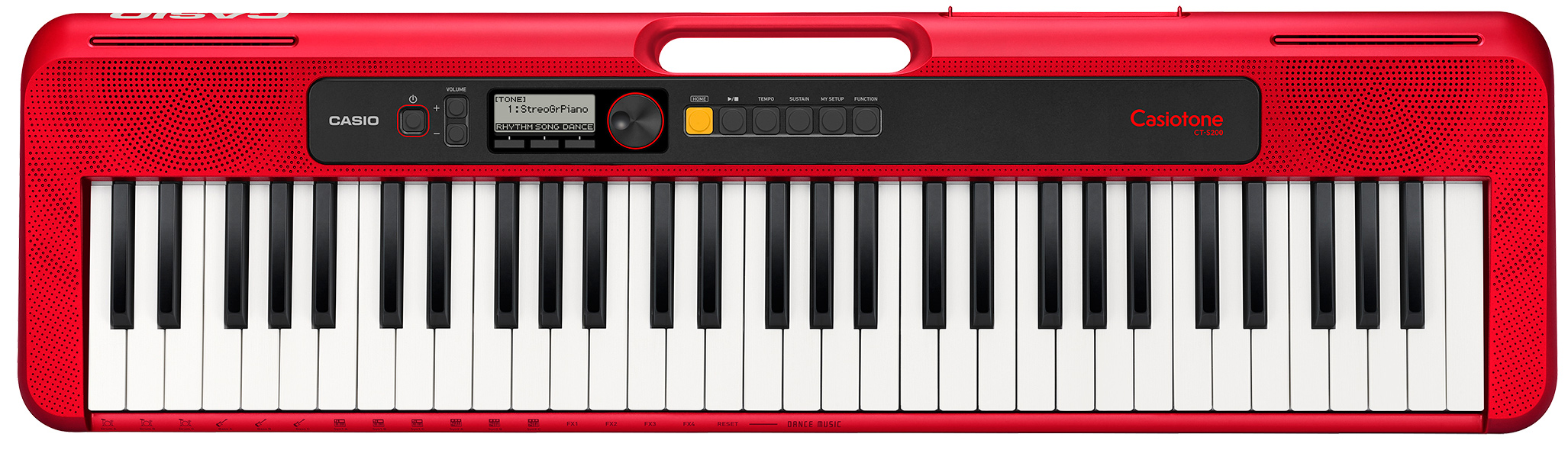 Синтезатор CASIO CT-S200RD модельного ряда Casiotone впечатляет своим великолепным звучанием, простотой управления и эргономичным дизайном.Благодаря ультракомпактным размерам (930 мм x 256 мм x 73 мм), что на 30% меньше, чем предыдущие модели CTK и большей автономности (увеличена продолжительность работы от батарей), эта модель линейки Casiotone предлагает исполнителям максимум свободы для реализации своих музыкальных идей. Малый вес, а также практичная ручка на корпусе позволяют использовать синтезатор в совершенно различных ситуациях, вне зависимости от внешних условий.Режим Dance Music Mode расширает возможности создания и микширования танцевальных треков, выбирая и программируя встроенные музыкальные фразы партий ударных, баса и синтезатора. Двенадцать различных звуков блока Dance Music Voices добавят больше креативных штрихов к исполнению, сделав композицию еще более уникальной и интереснойСинтезатор поддерживает работу с бесплатным приложением Chordana Play от CASIO - через смартфон или планшет.