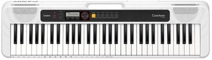 CASIO CT-S200WE – портативный синтезатор из линейки CASIOTONE от знаменитого японского производителя. Синтезатор оснащен 61-клавишной клавиатурой фортепианного типа. Это компактная модель весом всего 3,3 кг, которая может работать как от сети, так и автономно от батарей (6 батареек АА). Сверху есть ручка для переноски в руке, эргономичный обтекаемый дизайн корпуса делает синтезатор идеальным для транспортировки. Интерфейс синтезатора прост, удобен и интуитивно понятен. Полифония – 48 нот. Доступны 400 встроенных тембров, 60 предустановленных композиций, 77 вариантов ритма, реверберация десяти типов, метроном. Предусмотрена возможность подключения к компьютеру через USB. Встроенные овальные динамики размером 13 х 6 см с усиленными магнитами выдают удивительно мощное и качественное для такого компактного инструмента звучание.