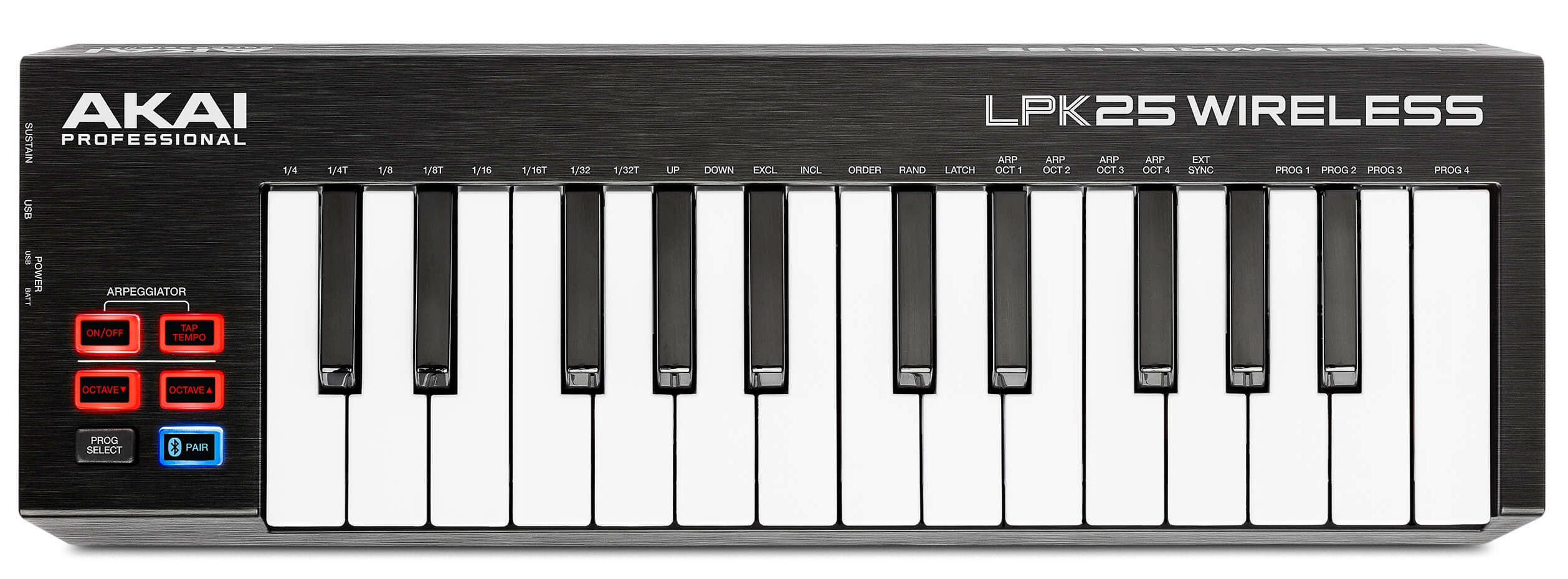AKAI PRO LPK25 WIRELESS – гибкий и многофункциональный компактный USB/MIDI контроллер с возможностью беспроводного подключения. Это в полной мере портативная модель, имеющая небольшие габариты и вес всего 490 грамм, которую можно подключать к компьютеру через Bluetooth (в том числе для работы с MIDI).