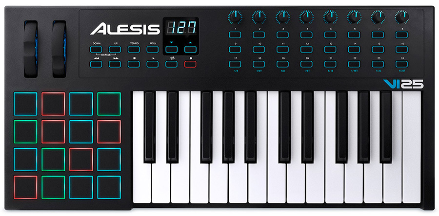 ALESIS VI25 представляет собой MIDI-клавиатуру. Клавиатура имеет 25 полноразмерных клавиш с функцией послекасания. Для работы и создания музыки есть 16 пэдов, чувствительных к скорости нажатия со светодиодной подсветкой, 8 ручек (назначаемые) и 24 кнопки (назначаемые). Также есть кнопки повышения и понижения октавы, колесо тона и модуляции. Питание клавиатуры осуществляется через USB порт. Используя MIDI-клавиатуру пользователи могут заниматься творчеством и музыкой практически в любом месте. Миди-клавиатуру можно взять с собой куда угодно, в поездку, тур, на гастроли или на загородный отдых.