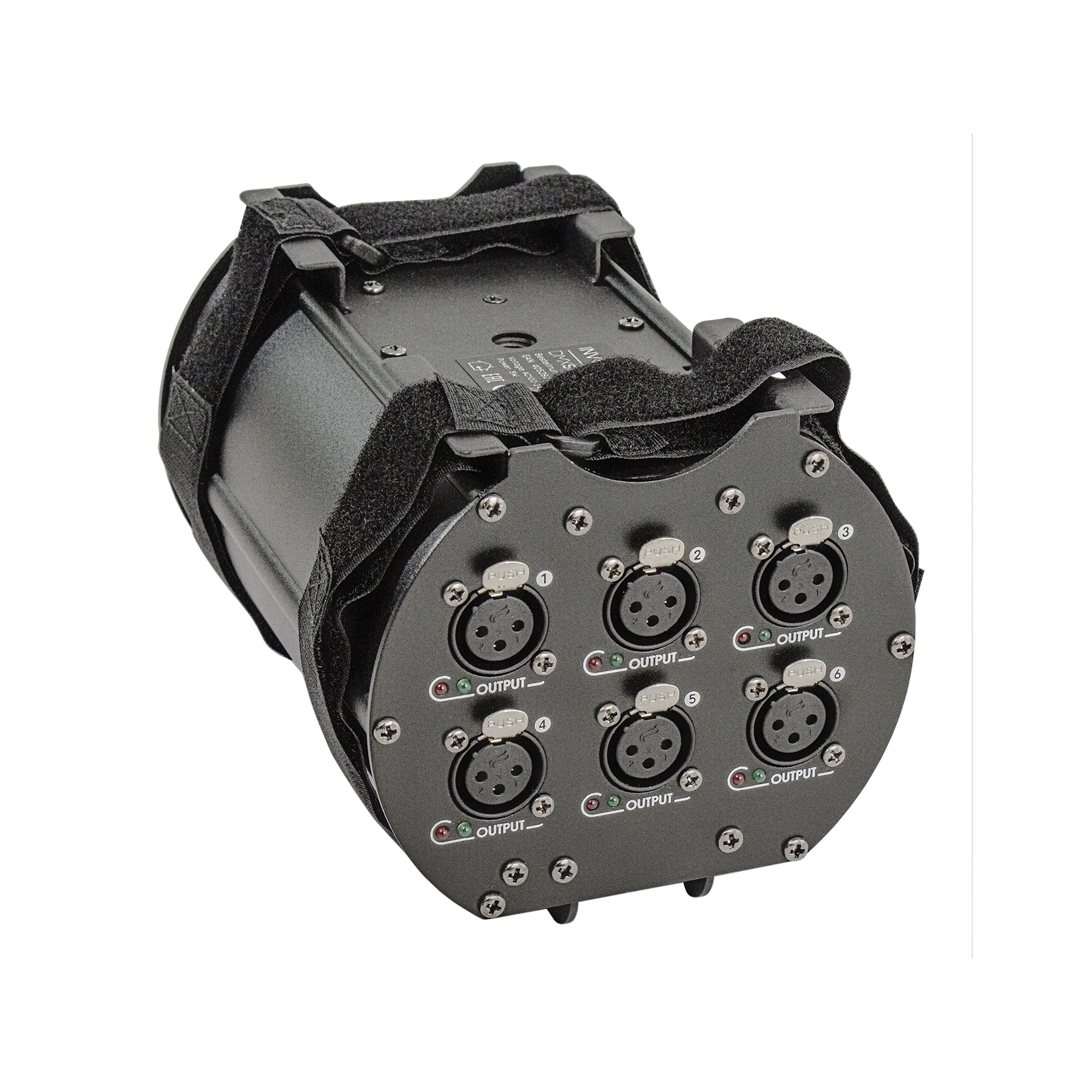 DMX-сплиттер "DMXS6" имеет один вход и шесть выходов. Для подключения на каждый канал предлагается трех-контактный XLR разъём, который служит в качестве DMX-выхода. Каждый DMX-выход имеет независимый трансформатор. С помощью переключателя LINK-выхода возможно завершить или продолжить DMX-сигнал на другие приборы.