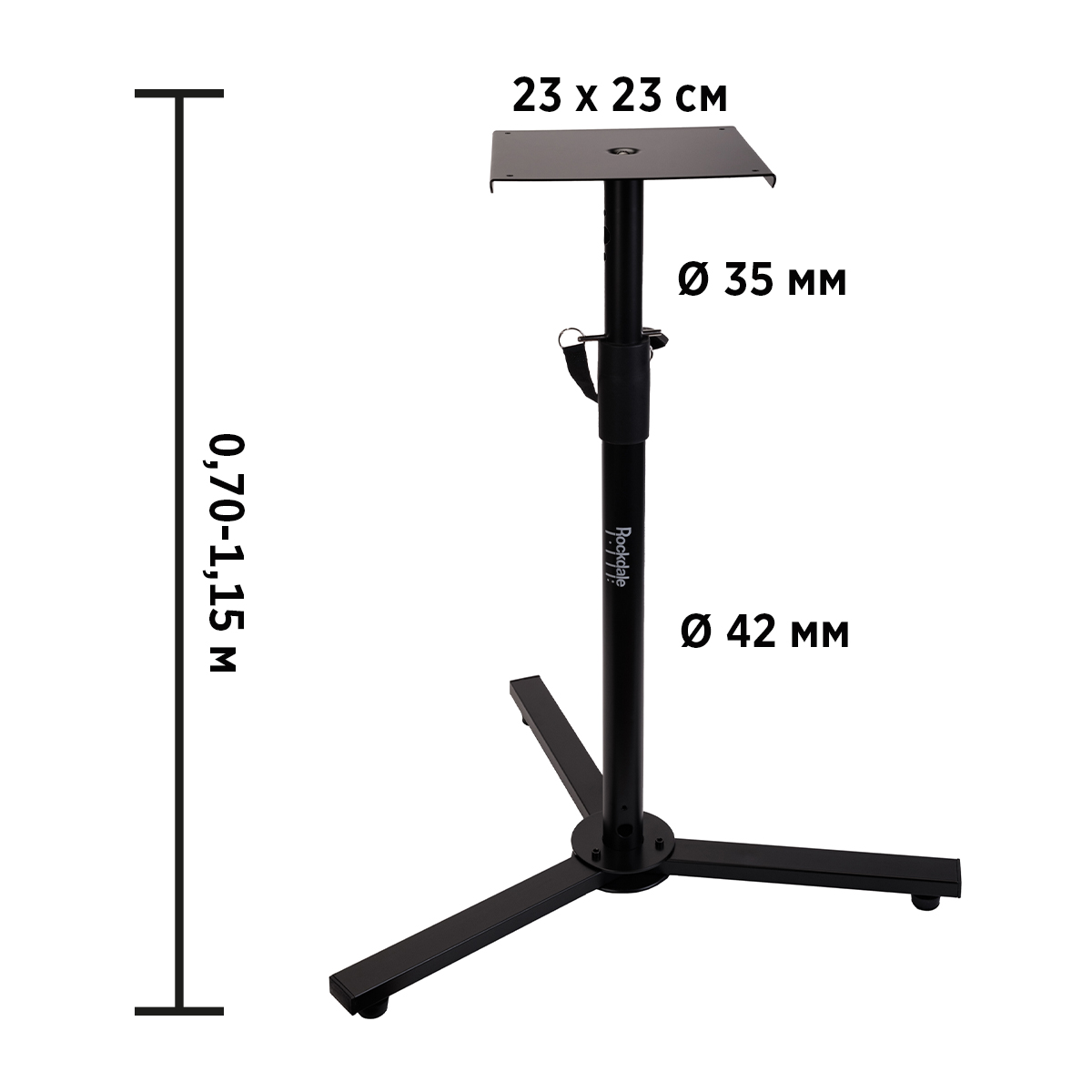 ROCKDALE 3330 – надёжная и удобная напольная стойка для установки студийных мониторов от известного производителя музыкальных инструментов и оборудования Rockdale. Модель можно использовать для размещения оборудования весом до 60 кг. Стойка устанавливается на пол, устойчивая тренога позволяет надёжно разместить её даже не на идеально ровной поверхности.